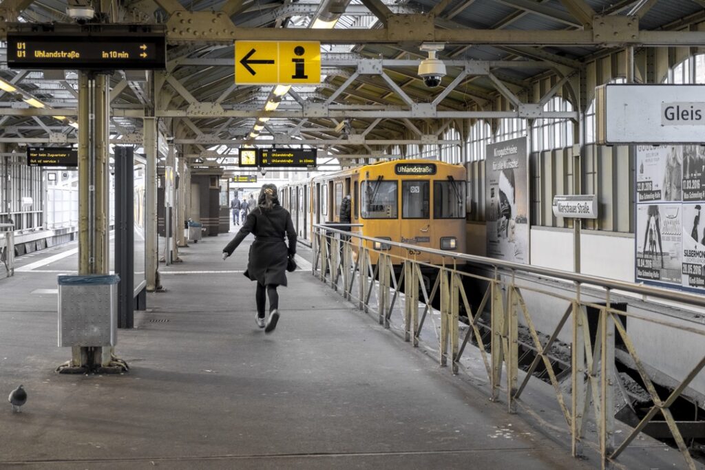 La rue est un théâtre sans scène. Une station de S-Bahn, un arrêt de bus, un quai, un café presque vide, un mur encore debout, un autre déjà promis à la disparition. Les corps passent, souvent flous, happés par le mouvement. Ils ne sont ni sujets ni figurants : ils font partie du rythme. Berlin impose cette vitesse variable, faite d’accélérations brusques et de suspensions inattendues. La photographie s’y glisse, attentive à ce qui résiste au flux.