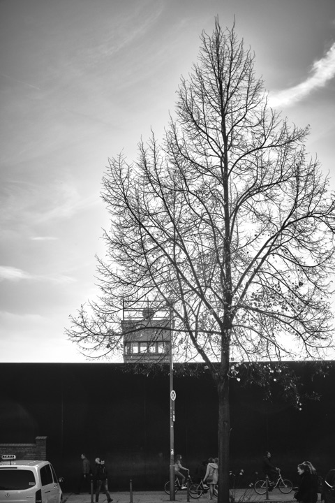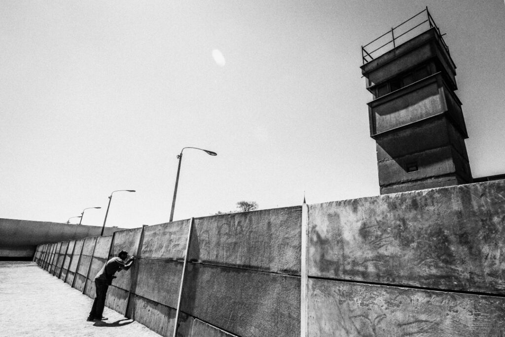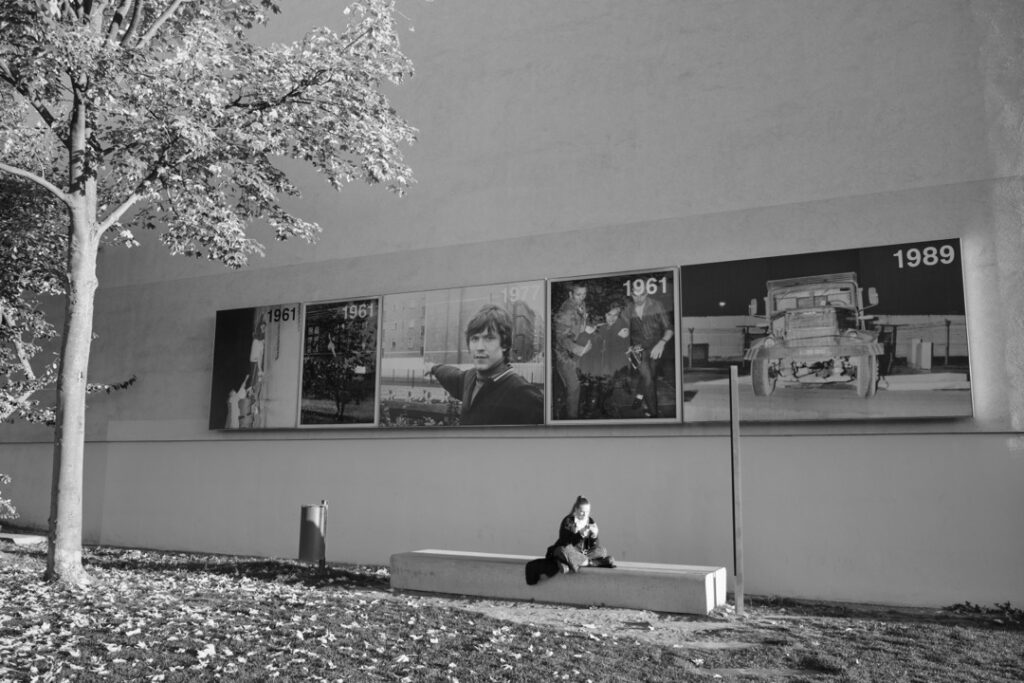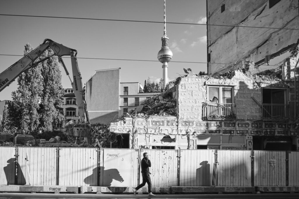 Berlin, dans cette série, n’est ni idéalisée ni dramatisée. Elle apparaît comme un espace de frottement constant : entre passé et présent, construction et effacement, mémoire et usage quotidien. Des tours de surveillance devenues objets presque abstraits, des murs transformés en surfaces neutres, des chantiers qui redessinent le paysage sans jamais le stabiliser. La ville semble toujours en train de se refaire, sans chercher à se réparer.
