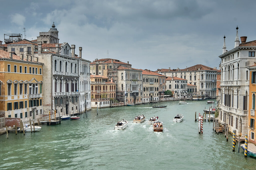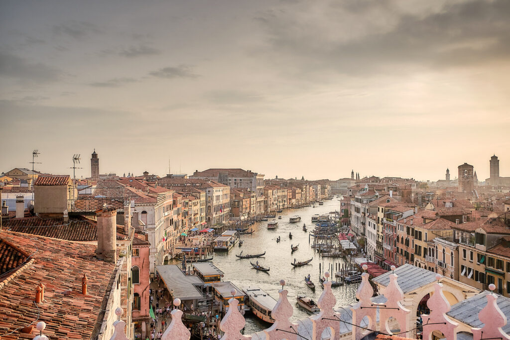 Depuis les hauteurs, Venise se laisse lire dans une ampleur plus apaisée. Le Grand Canal s’étire lentement, bordé de façades aux teintes chaudes, patinées par le temps. À cette heure du jour, la lumière adoucit les contrastes et unifie les volumes, tandis que le passage régulier des embarcations maintient un mouvement discret. Gondoles, vaporetto et bateaux de service dessinent des trajectoires lentes, donnant au paysage un rythme continu. Ce point de vue en surplomb offre une respiration dans le récit, révélant une Venise à la fois vivante et silencieuse, suspendue entre l’agitation et l’attente.